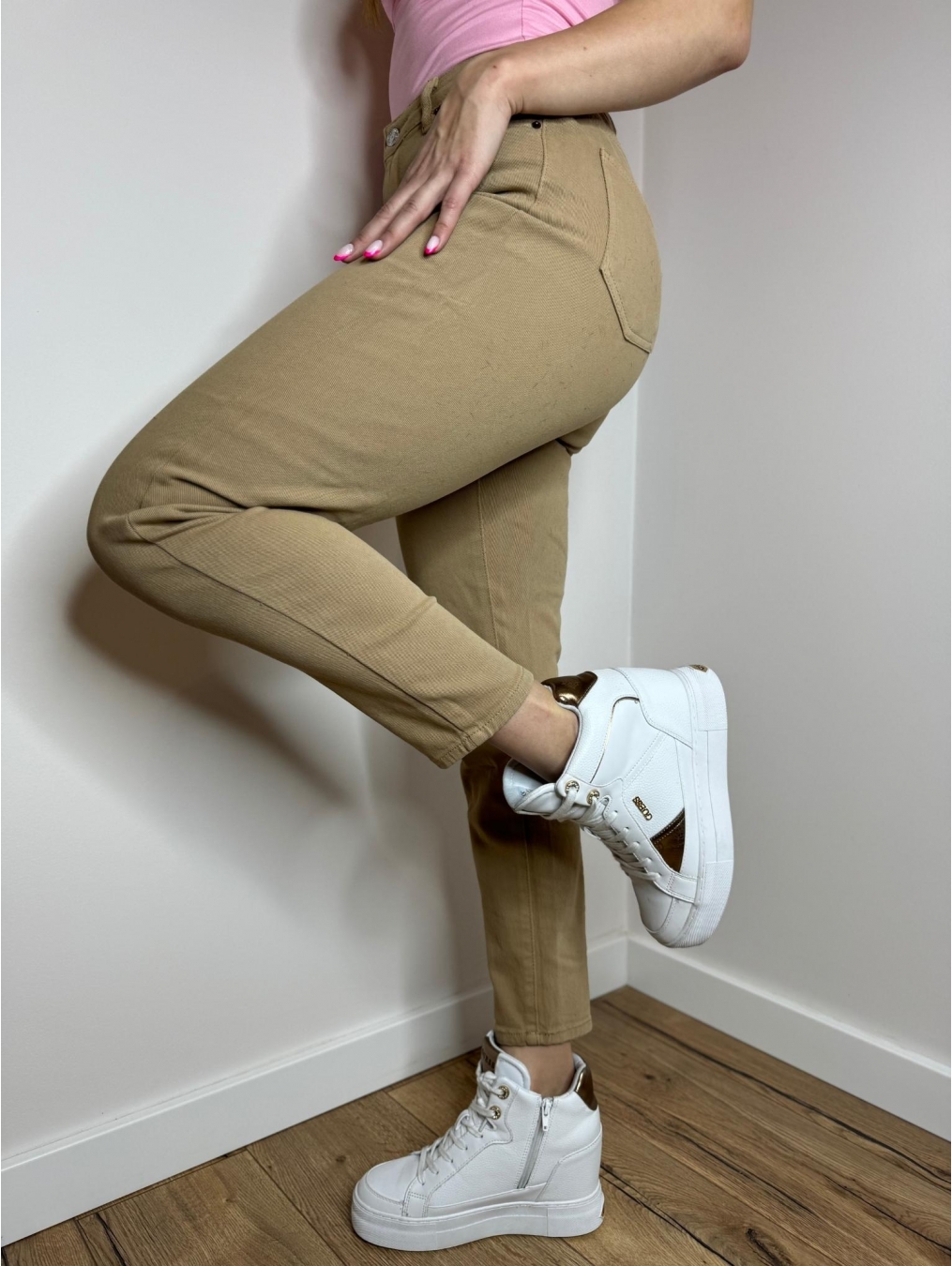 Zapewnij sobie zarówno stylowy look, jak i wygodę dzięki naszym beżowym spodniom z wysokim stanem. Typ mom fit nadaje luźnego charakteru, jednocześnie subtelnie modelując sylwetkę. Wykonane z rozciągliwego materiału, spodnie zapewniają nie tylko swobodę ruchów, ale także komfort na każdym kroku. Dzięki swojemu minimalistycznemu designowi i neutralnemu kolorowi, są one bardzo wszechstronne i łatwo dopasowują się do różnych stylizacji. Niezależnie od tego, czy chcesz stworzyć casualowy look, czy bardziej elegancką stylizację, te spodnie będą idealnym wyborem. Stanowią one również wyraz osobistego stylu, pozwalając Ci wyrazić swoje indywidualne preferencje modowe.