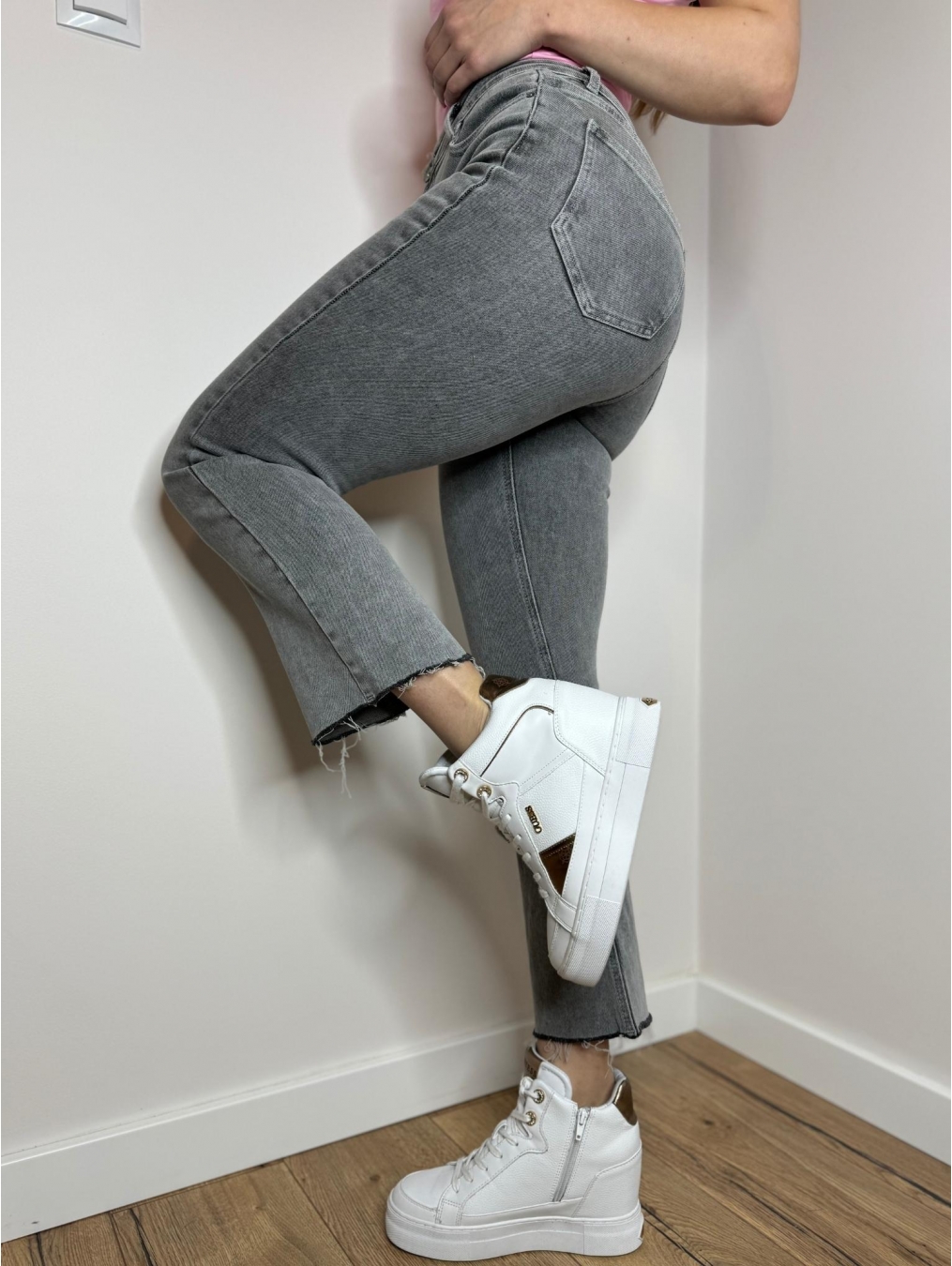Spodnie w kolorze szarego jeansu to kluczowy element garderoby dla osób ceniących sobie zarówno wygodę, jak i modny wygląd. Stanowią połączenie elegancji i komfortu. Wykonane z rozciągliwego materiału, doskonale modelują sylwetkę, podkreślając naturalne kształty. Ten fason łączy elementy klasycznego dopasowania ze smukłym, lekko rozszerzającym się krojem na dole. Nogawki dodają oryginalności, a jednocześnie zapewniają swobodę ruchów. Te spodnie są nie tylko stylowe, ale także bardzo uniwersalne, pasujące zarówno do casualowych, jak i bardziej eleganckich stylizacji. Będą one doskonałą bazą do tworzenia różnorodnych outfitów, które zawsze będą prezentować się modnie i z klasą.
